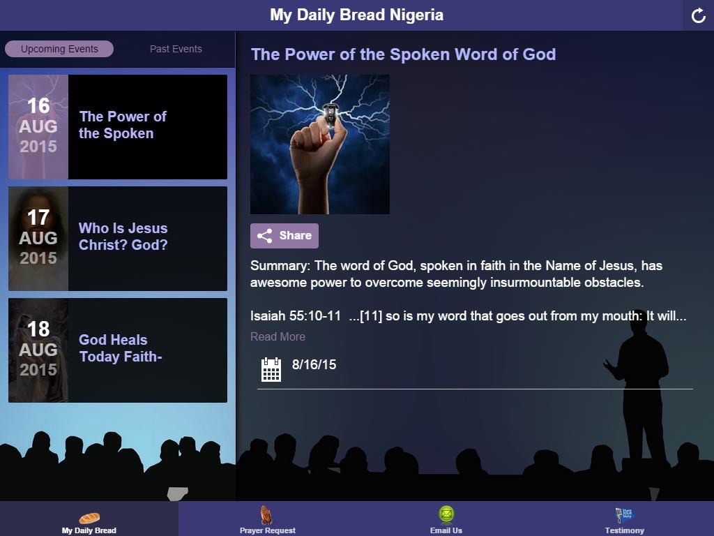 In this app you can read daily prayers as it affects other peoples lives. You can make prayer request and submit your testimonies. You will receive daily prayers at 6:00am everyday