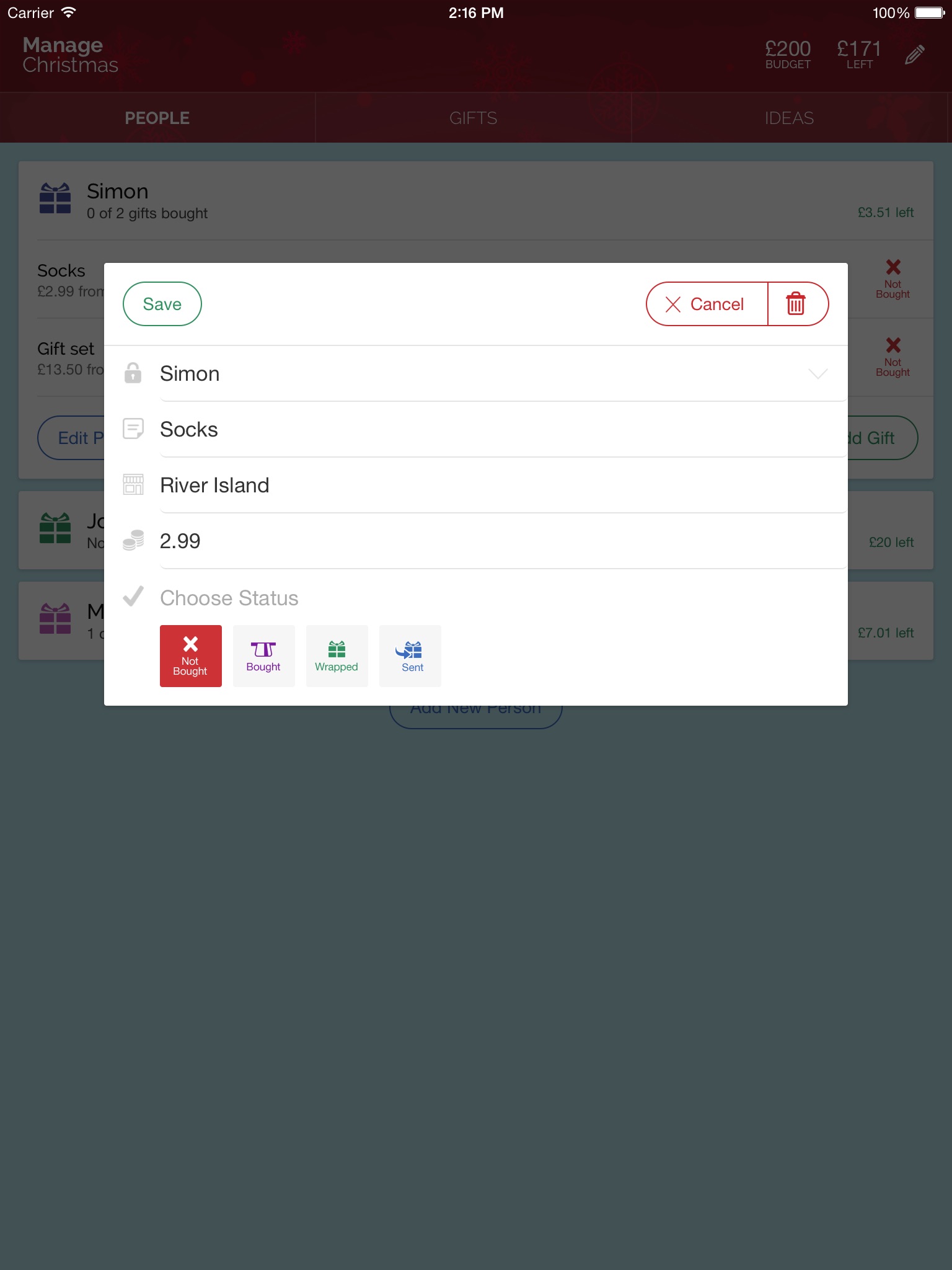 This is a clean app that helps keep track of gifts and spending. Nice interface, easy to use, multiple currency support and password protection. Would be to add syncing via icloud, drop box or some other service. Also ability to reorder people in the list would be good.