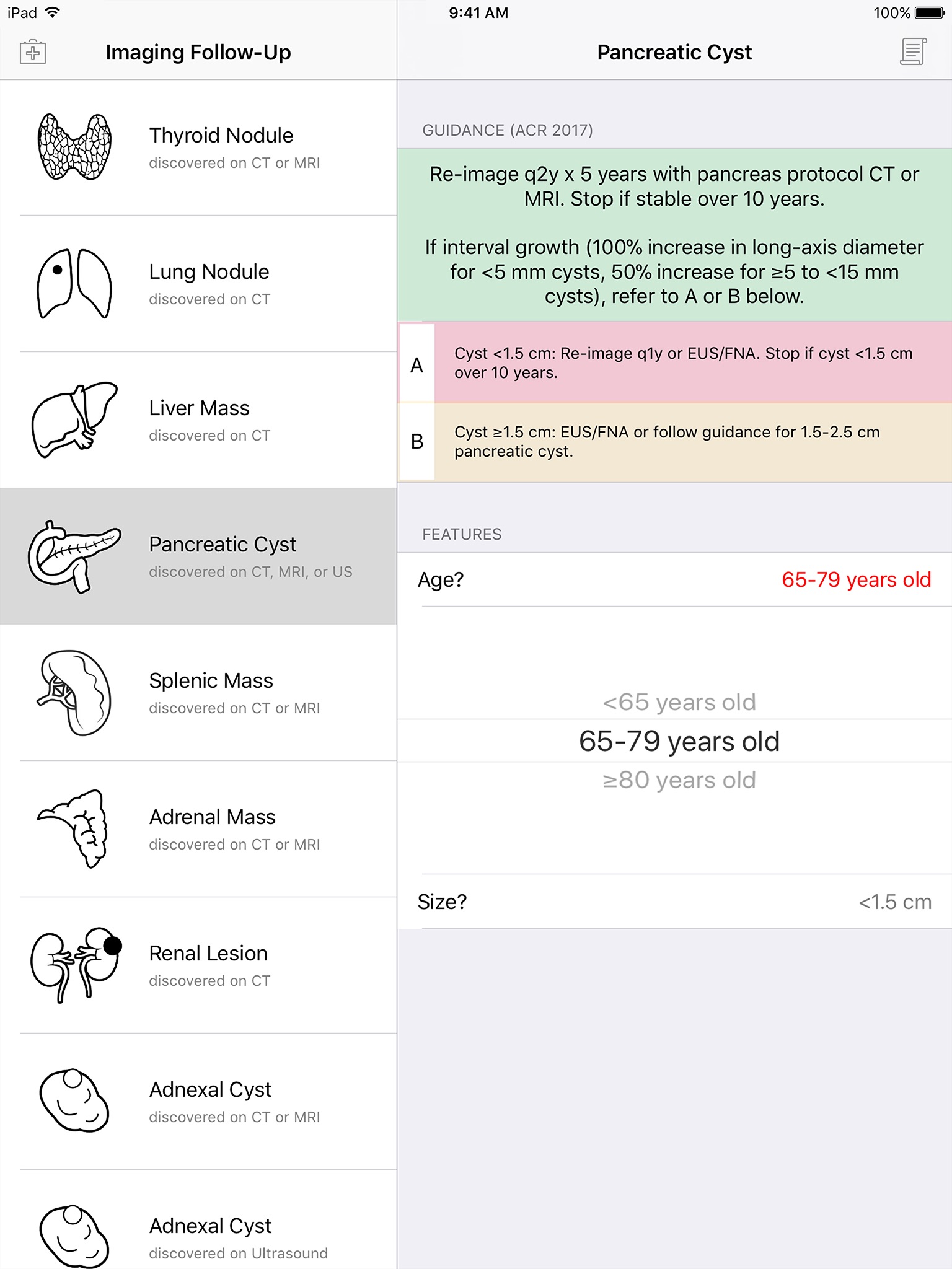 This app guides you through an effortless adaptation of the most current guidelines of the American College of Radiologys Incidental Findings Committee, Fleischner Society, and Society of Radiologists in Ultrasound.