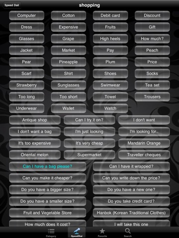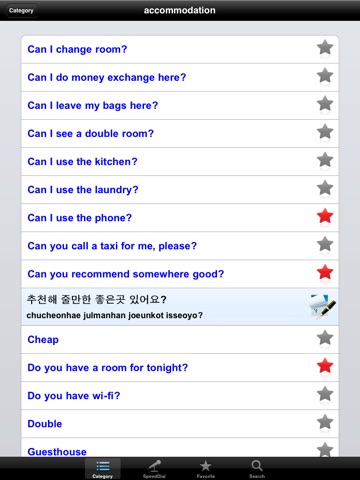 + Organized in 17 categories,Greetings,General conversation,Directions,Transportation,Eating out,Shopping etc