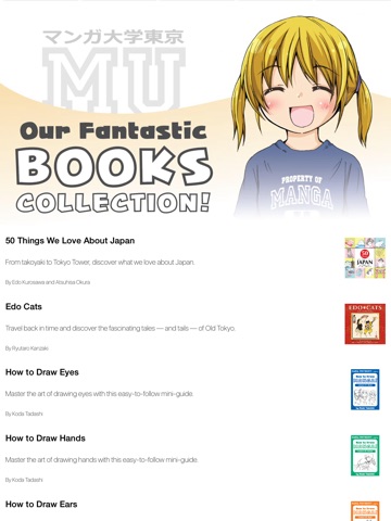 The app also comes with a complete catalog of Manga University books (with links so you can get them on the Apple Books store); our popular gallery of YouTube videos (including the "How to Draw Manga" series featuring Mosoko Miyatsuki); and news and interviews from our Tokyo Campus Blog.