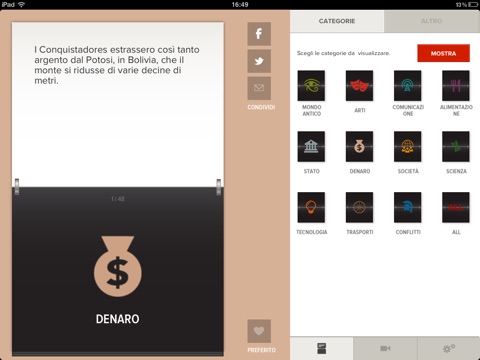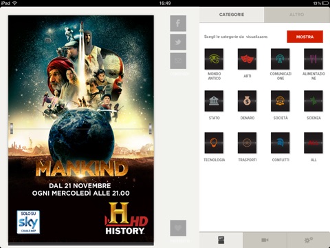 L’App Mankind di History (in onda dal 21 novembre 2012 alle 21 sul canale 407 di Sky) ti aiuta ad approfondire la storia della civiltà umana con un’esclusiva raccolta di interessanti curiosità. Ispirata all’innovativa serie Mankind – La storia di tutti noi, l’applicazione presenta centinaia di brevi fatti storici scritti e curati dal team di History. Inoltre ti accompagna a scoprire la serie con video, foto e infografiche esclusive. Una semplice interfaccia flip clock permette di esplorare le curiosità in base all’argomento o alla popolarità, oppure di sfogliare semplicemente le curiosità a caso. Se vuoi stupire i tuoi amici, scoprire qualcosa di nuovo o solo distrarti un po’, questa App ti offre l’opportunità per saperne di più sulla storia dell’umanità.