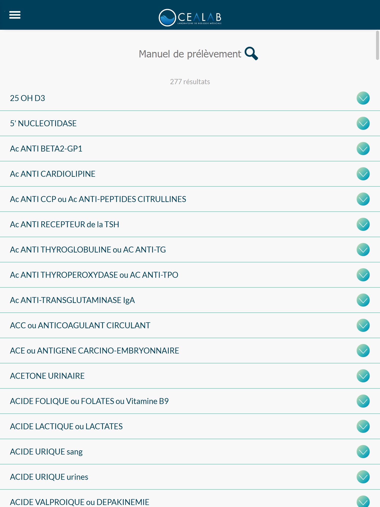 Les laboratoires Océalab vous proposent lapplication "Manuel de prélèvement", destiné au professionnels de santé. Vous retrouverez pour chacun des prélèvements toutes les règles nécessaires à lobtention dune analyse correcte. Disponible en-ligne et hors-ligne, vous aurez à tout instant accès à la base dinformations.