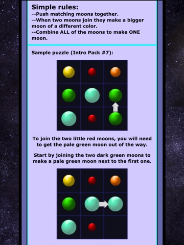 ---Every move can be made in two directions. It usually helps to pick the way that will put the new moon within sight of as many matching moons as possible.