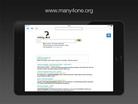 Many4one is one of the search engines you have been looking for. You search and we donate most of our profit for education, health and development. Our search engine is a social business devoted to helping children and improving health facilities in Eastern Europa and Afrika. So all you have to do is to use this cool apps. Help us so that we can help others.