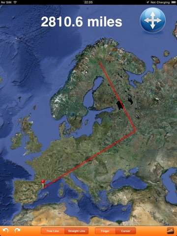 The distance can be shown in international units (Meters/Km) or American units (Feet/Miles/Yards). The application can be used in either Map-Mode or Satellite-Mode.