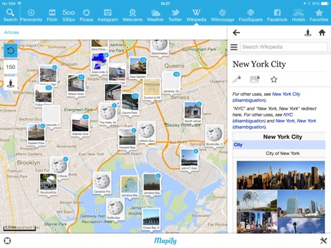 Facebook, Twitter, Instagram, 500px, Foursquare, Wikipedia, Flickr, Picasa, Google, 26 000+ webcams, Weather, Wikivoyage, Street view and many more - everything public or from your friends with geo-location data.
