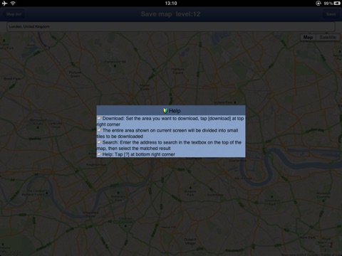 色々とオフラインで地図が見れるアプリを試したんですが、 これは素晴らしいですね。 シンプルですが、操作はとても簡単です。ダウンロードし たいエリアを表示したら後は、タイルの数を選択するだけ。 ダウンロード時に地図に好きな名前が付けられ、ダウンロ ードした地図の削除なんかも簡単に行えます。 これからも発展して欲しいので気になった点や希望する改 善点を以下に挙げておきます。 ・ダウンロードのタイル数制限を上げて欲しい。 1024tileはちょっと少なく気がします。4倍もしくはそれ以 上に上げて頂くと広域の地図が管理出来て良いと思います。 ・ダウンロードしたタイル毎に表示されるGoogleロゴ これはちょっと難しいのかもしれませんが、拡大時には、 やはり気になってしまいます。 ・ダウンロード中にアプリが落ちる 特に大きいサイズの地図を落としている時によく落ちます。 ダウンロードはレジュームが行えるので、都度立ち上げて 再開してますが、ちょっと面倒ですね。 ・アイコン、オープニング画面がダサいw 大変失礼ですが、せっかく素晴らしいアプリなのにアイコン や起動時の画面がちょっとショボ過ぎ..、もといシンプル過 ぎるw気がします。 とまぁ、色々と書かせて頂きましたが、大変便利に使わせて 頂いておりますので、これからのバージョンアップに期待し て星4つとさせて頂きます。