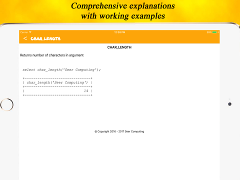 Our MariaDB Reference app lists all available functions, gives a concise explanation of each and at least one example of its usage, each accompanied with the output of the select statement.