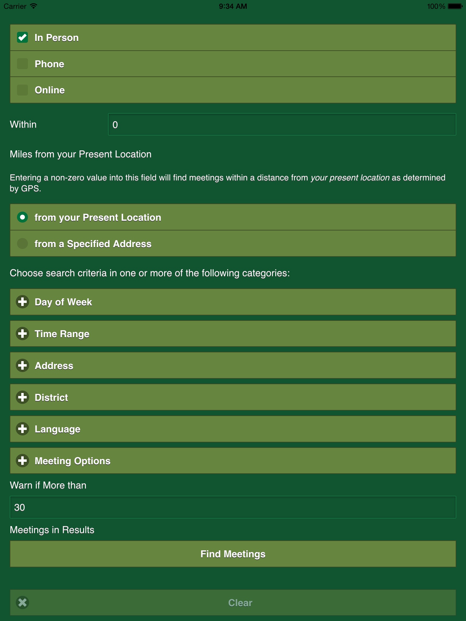 Your location is sent to our servers only when you, at your sole discretion, explicitly do a search for meetings within a specified radius from your present location.