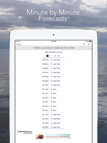 •AccuWeather MinuteCast™ – minute-by-minute weather forecasts for the next two hours hyper-localized to your exact GPS location or street address. Includes precipitation type and intensity, and start and end times for precipitation. Available for the United States and Canada. Boaters within 400nm of the coastline can use MinuteCast to track and time storms, and select a map point to get MinuteCast for that location in addition to their current location.