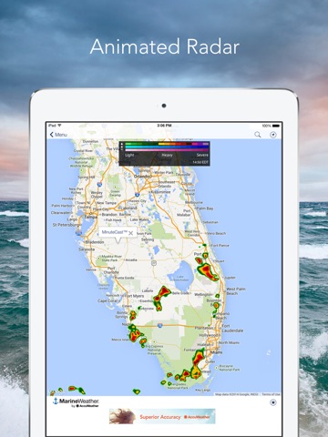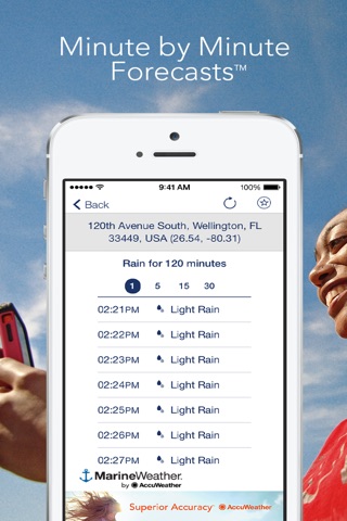 •AccuWeather MinuteCast™ – minute-by-minute weather forecasts for the next two hours hyper-localized to your exact GPS location or street address. Includes precipitation type and intensity, and start and end times for precipitation. Available for the United States and Canada. Boaters within 400nm of the coastline can use MinuteCast to track and time storms, and select a map point to get MinuteCast for that location in addition to their current location.