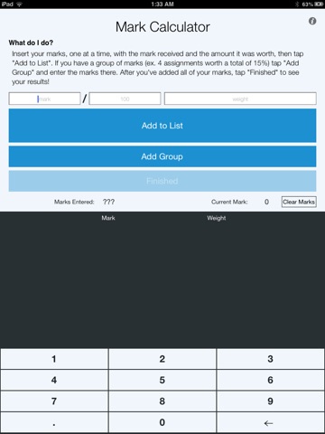 Simply enter in a mark, and the weight it was worth (both in percent) and tap add to list. Then, add as many marks as you have, then hit finished to see what your grade will be like with different exam marks.