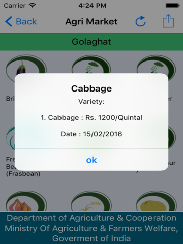 AgriMarket mobile app can be used to get the market price of crops in the markets within 50 km of the device’s location. This app automatically captures the location of person using mobile GPS and fetches the market price of crops in those markets which falls within the range of 50 km. There is another option to get price of any market and any crop in case person does not want to use GPS location.