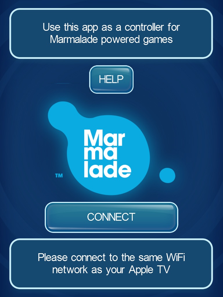 Make sure the device on which you’re running this app is connected to the same WiFi network as your Apple TV and you’re good to go. Start your compatible app on Apple TV, launch the Marmalade Multiplayer Game Controller on your iPhone/iPad/iPod Touch (iOS 6 or later) and have fun!