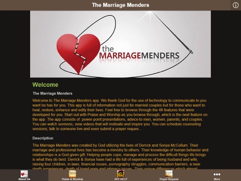 Over 80 features that meets the needs of Families, Married Couples, Engaged Couples, Singles, Parents, Men, Women and Teens. The app includes: Christian Devotionals, Sermons, Power Point Presentations, Videos, Mental Health and Relationship Inventories, 24/7 Counseling Line, and the opportunity to schedule appointments for counseling. The app user can also book speaking engagements which includes; seminars, retreats, workshops and lectures for families, married couples, singles, teens, men and women. The app user will receive weekly live videos which will motive, enhance their relationships.