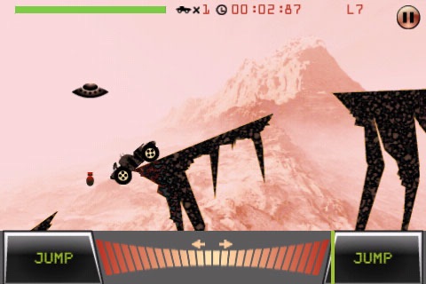 Take a perilous journey across Martian landscape in this unique platform, physics game built specifically for the iPhone. Navigate your space AV over challenging terrains while avoiding destruction by evil Martians, land mines, wicked projectiles, or even falling into bottomless chasms.