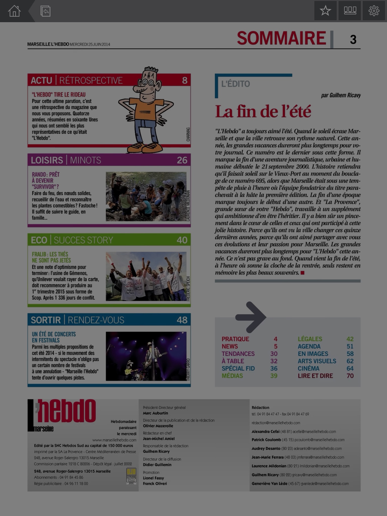 Depuis 10 ans, chaque semaine, Marseille lHebdo est la référence pour savoir ce qui se passe à Marseille. Retrouvez tous les mercredis 80 pages dactu et de bons plans. Un city guide pratique et malin ! Cest dabord 25 pages dactualité pour tout savoir de la politique, du social, de léconomie, des médias et des évènements à ne pas louper mais aussi tout ce quil faut retenir de la vie de la ville. Retrouvez également dans la section "loisirs" les rendez-vous tendances et fashion, ceux pour les enfants et leurs parents, lagenda de la night ainsi que les tables à essayer... ou à éviter ! Une grande partie (plus de 30 pages !) du journal est enfin consacrée aux sorties : musique, théâtre, danse, cinéma et expositions. Suivez nos coups de coeur et partez à la (re)découverte de Marseille !