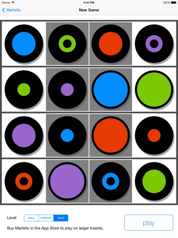 With Martello Quattro you can play on a board of size 4 by 4. Our other app Martello ® allows you to play on boards of size 3x3, 4x4, 5x5 and 6x6.