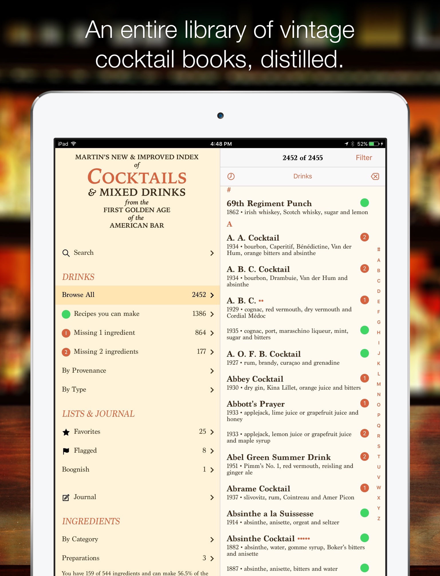 This is absolutely the best cocktail app on the market. Whereas some apps just dump cocktail recipes into a clunky interface without background or context, Martins Index really digs deep for the true bar geek who appreciates the vintage classics and lost gems of the cocktail realm. The apps secret weapons are the ingredient descriptions: Tap an ingredient in a recipe and youll find out what it is, where it is from, how it is made, what its history is, and what the best brands are to buy. Further, the app is a living document that updates FREE to all buyers. When I bought the app, the database had about 1500 recipes. As of this writing, it now stands at about 2500. Add to this the quick bar inventory function and the advanced sorting abilities and you have the perfect vintage cocktail app. Get it. It is definitely worth the asking price.