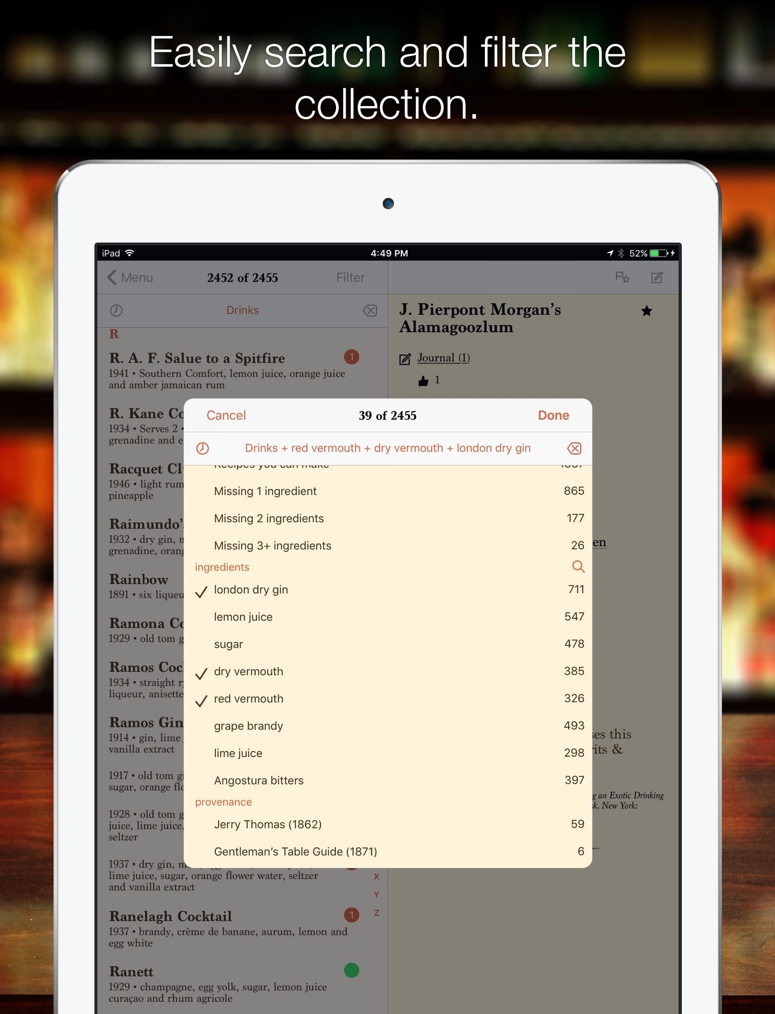 Instant access to the greatest knowledge, with all the modern conveniences of "in my bar" filters and unit conversions. I still use Cocktails+ miraculously, and am happy to see its reincarnation with ongoing support!