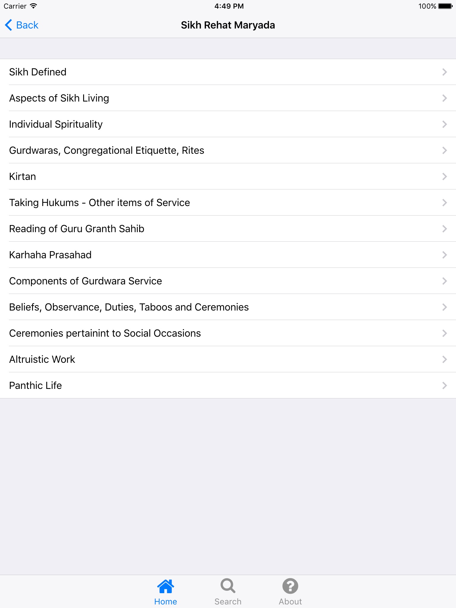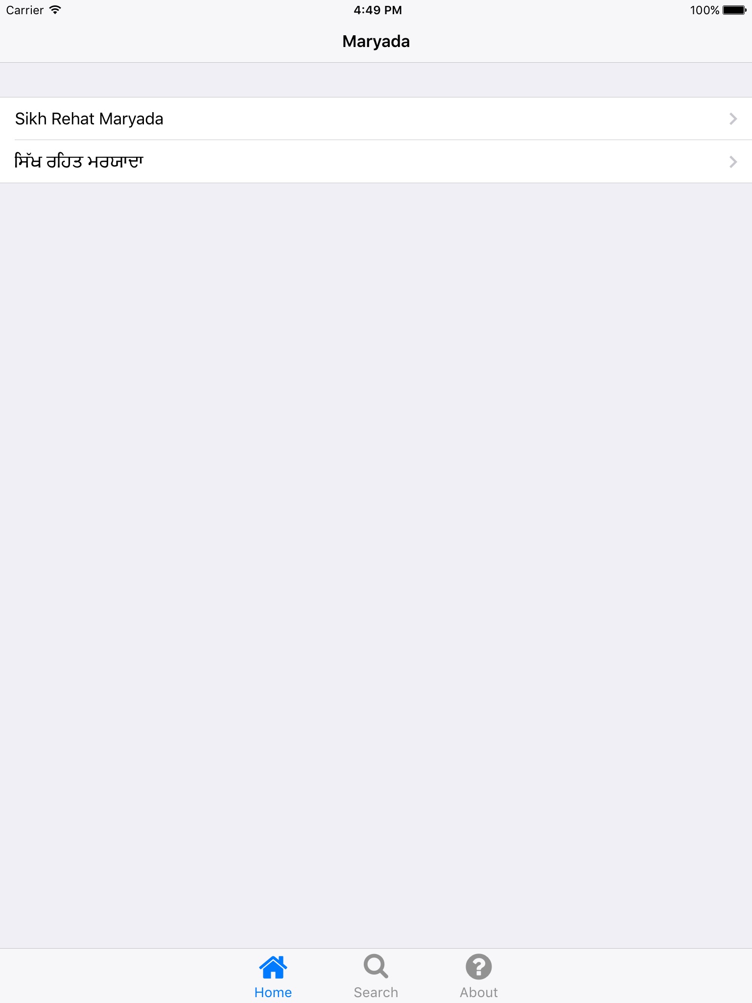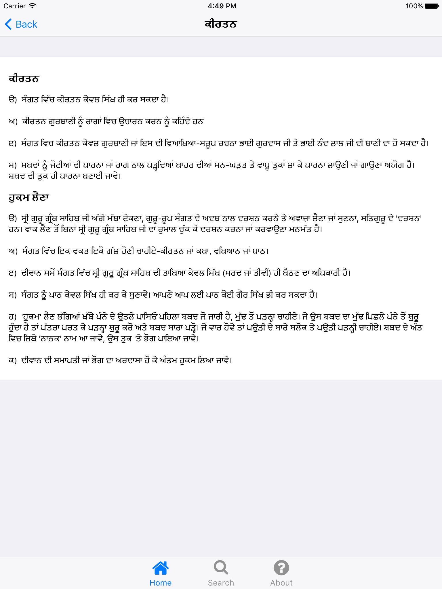 The Sikh Rehat Maryada is a code of conduct for Sikhs. The app has both a gurmukhi (punjabi) and English version of the most current rehat maryada.