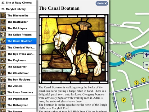 The app contains one walking trail, 28 points of interest, 20 stained glass panels, an archive map and a wartime aerial photo. You’ll see historic buildings (including the restored Burgh Halls and Maryhill Leisure Centre), ancient monuments (such as the canal locks and aqueduct), and one of Charles Rennie Mackintosh’s least well known buildings. You’ll follow the route of old railways lines, discover the location of many of the famous Maryhill stained glass panels, and maybe even see the odd heron or swan along the way.
