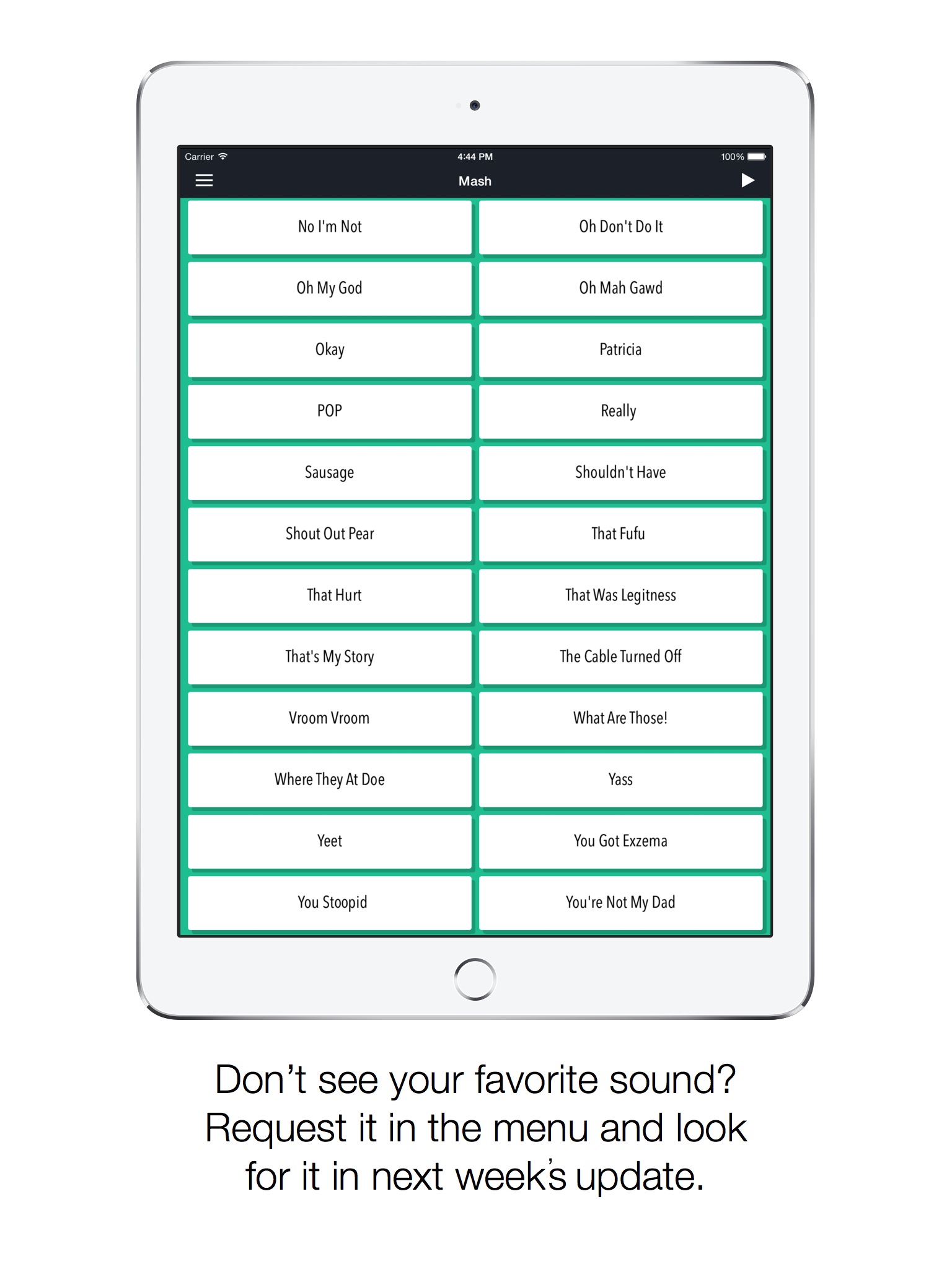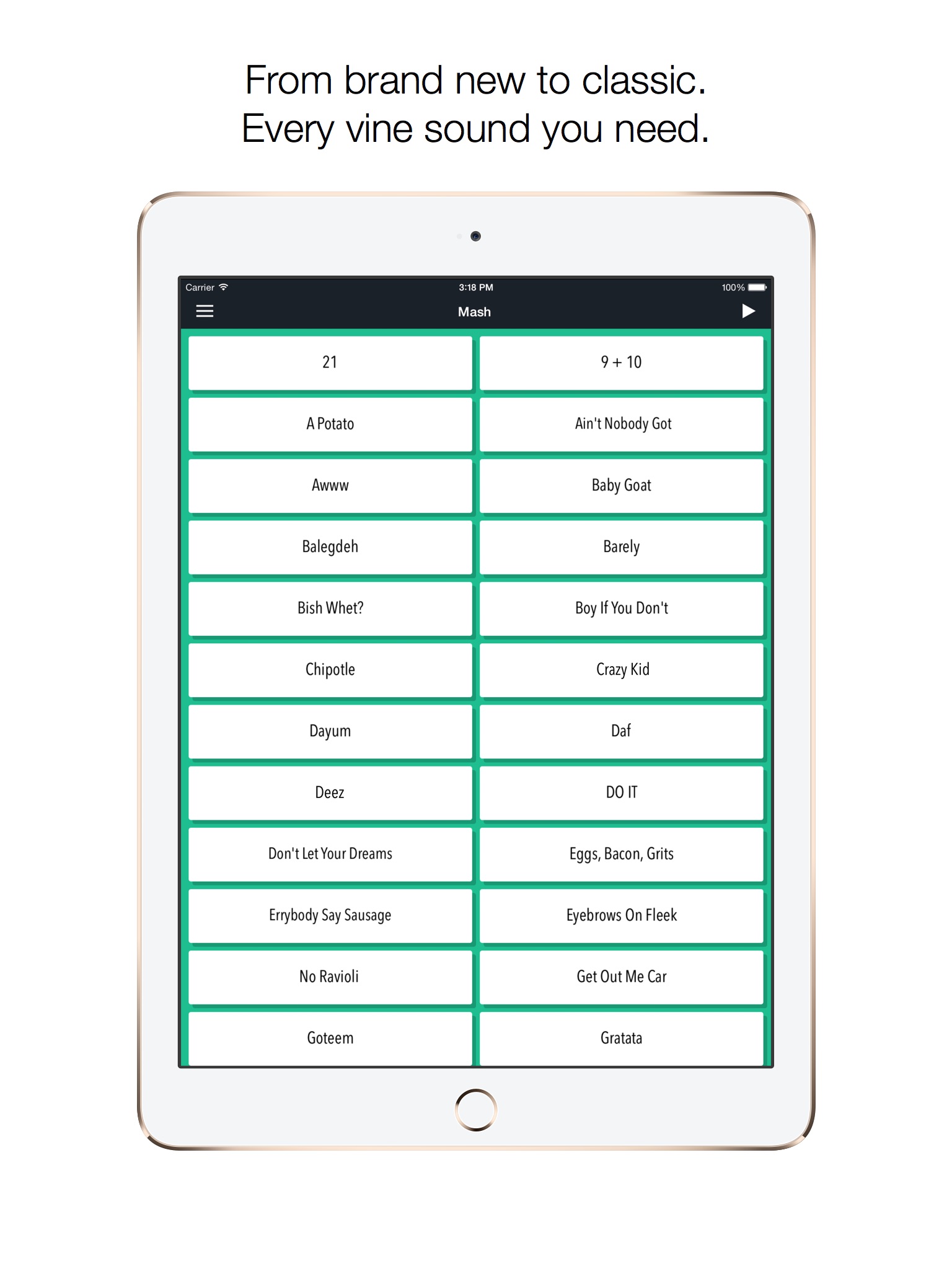 70+ fresh and classic Vine sounds including: Just Do It, What Are Those, Goteem, Im Legally Blind, POP, Sausage, 21, Lebron James, Okay, Yeet and much more!