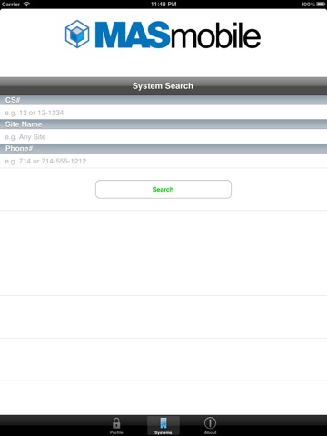 Users may use MASmobile to view and manage monitored systems within their business. Various features include Systems Status Summary, System Test, Zones, Event History, Test History, Sites, and Contacts.