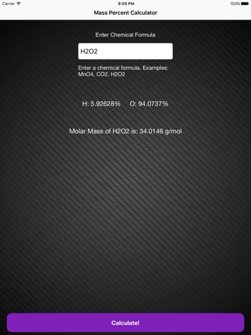 This app calculates the mass percent of a chemical formula that the user inputs. It also calculates the molar mass.