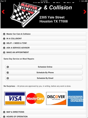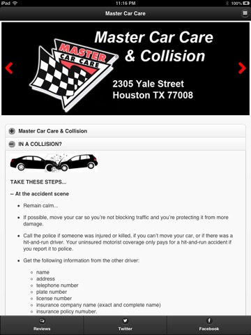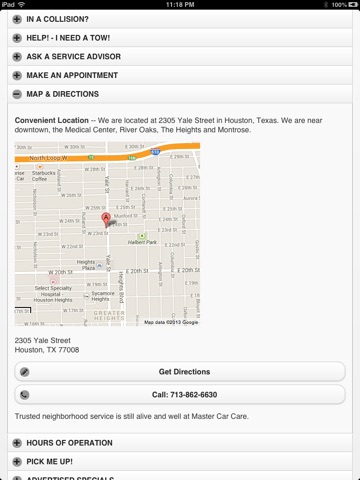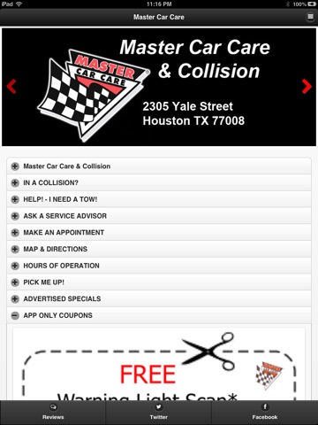 Free app for customers of Master Car Care in Houston, Texas, that gives the customer instant 24 hour access to help, from getting a tow, scheduling a service appointment, arranging a ride to or from our shop, or accessing hours, directions and money saving coupons. The app is designed to instantly allow help to be reached with one push of a button when using your iPhone. With a mobile data plan you can quickly get directions, email a service advisor with a question about your car, read and write reviews and keep up with our social media services