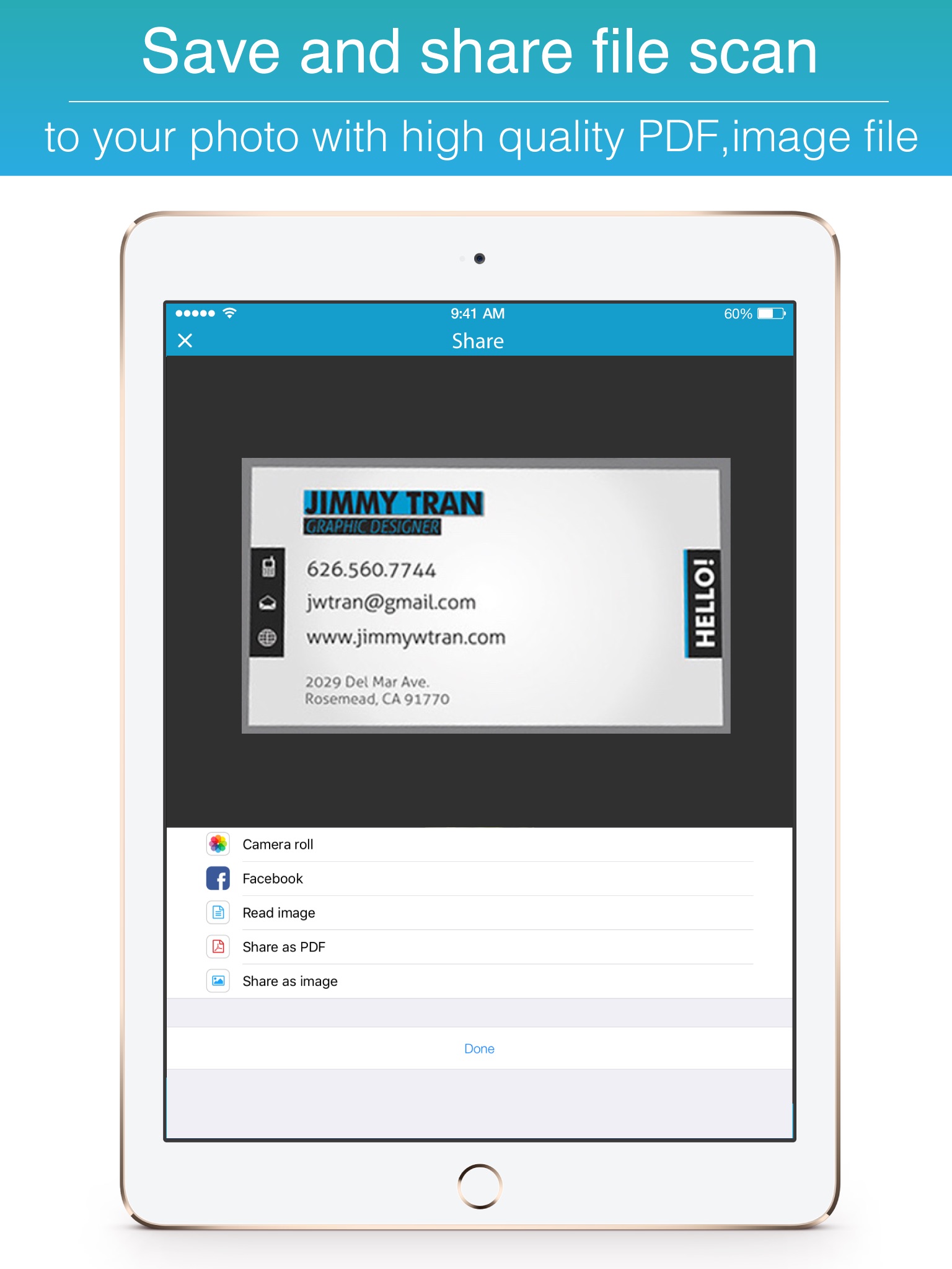 • Quickly scan any business card and document anywhere, when you dont have a scanner at hand.