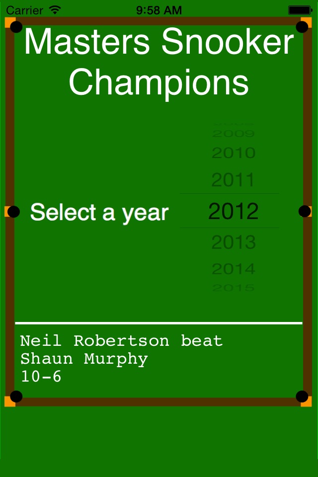 Masters Snooker Champions supplies you with all the winners of the Masters Snooker Championship throughout history in an easy to use, simple, intuitive manner. Although the Masters is a non-ranking tournament, it is second only to the World Championship (see our other app, World Snooker Champions for winners of the World Championship) in prize money.