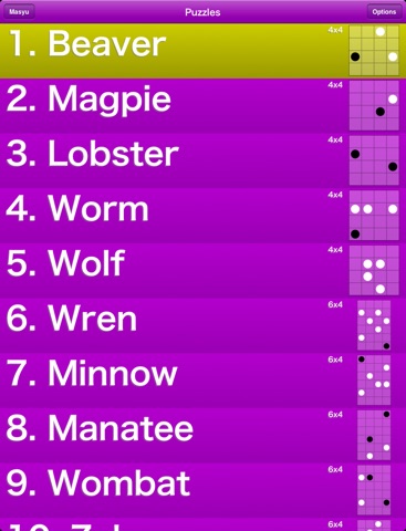 Masyu is a beautifully simple visual logic puzzle. Invented in Japan, Masyu is played on a grid and has a simple goal: to draw a single non intersecting loop through a set of circles scattered throughout the grid. Masyu is easy to learn and surprisingly addictive.