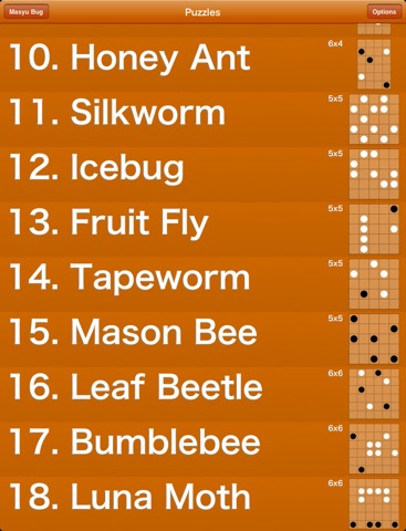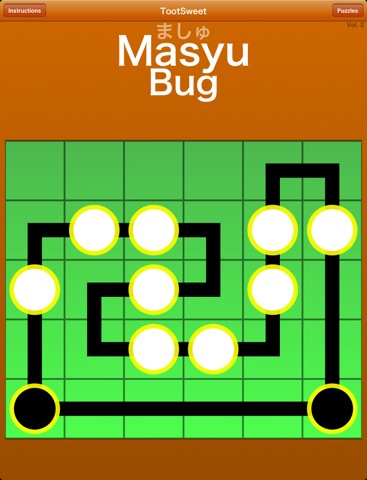 Masyu Bug is collection of puzzles aimed at younger and more casual puzzlers. Masyu Bug features the same interface as its predecessor, Masyu.