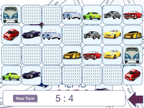Game starts with all cards turned face down. When you tap one - it will turn and you need to remember the picture on it. Then - you should try to find the card with same picture as the uncovered one, and if they match - both will remain opened, you get one point and its still your turn. If you fail, the cards turn back and then it is your opponent turn. Look at your opponent moves to learn about other cards locations.There are various strategies - sometimes its better to loose at the beginning and then clean whole board in one long turn. Otherwise both cards will flip back over and you will get another try. Try to find all matched cards as fast as possible.