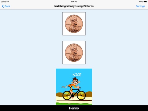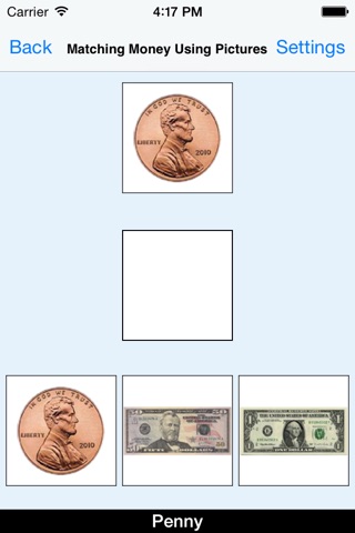 Here a coin or bill is shown at the top of the screen. The student is asked to click on the matching coin or bill shown among others at the bottom of the screen.