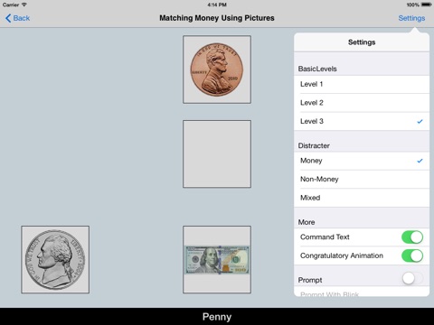 This level is selected by default. One coin or bill appears at the top of the screen. When this option is selected, three items (coins or bills or pictures) are shown at the bottom of the screen to be matched with the coin or bill at the top of the screen. There is one correct choice and two distracters. You can choose one coin or bill or non-money, or “Mixed" distracter.