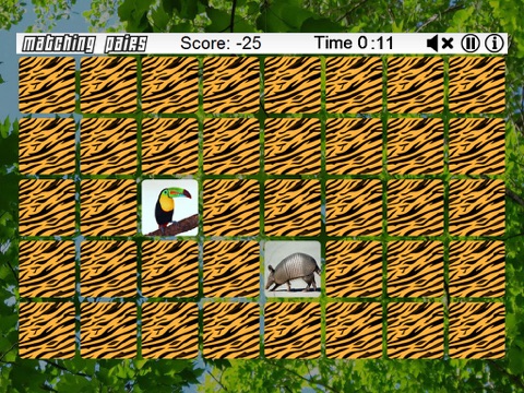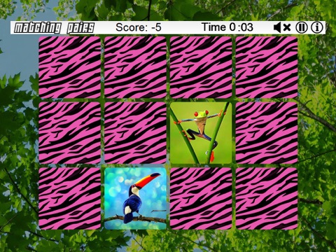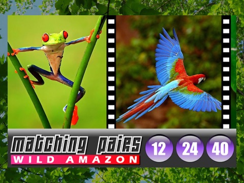 Matching pairs game with backdrop of wild animals of the tropical rainforest of the Amazon. Explore the beauty of jungle wild life of exotic South America. Select from 3 levels of difficulty with a choice of 6 to 20 pairs. Flip 2 cards, remember their locations and match them. Game is completed when all cards have been paired. Test your memory skills today!