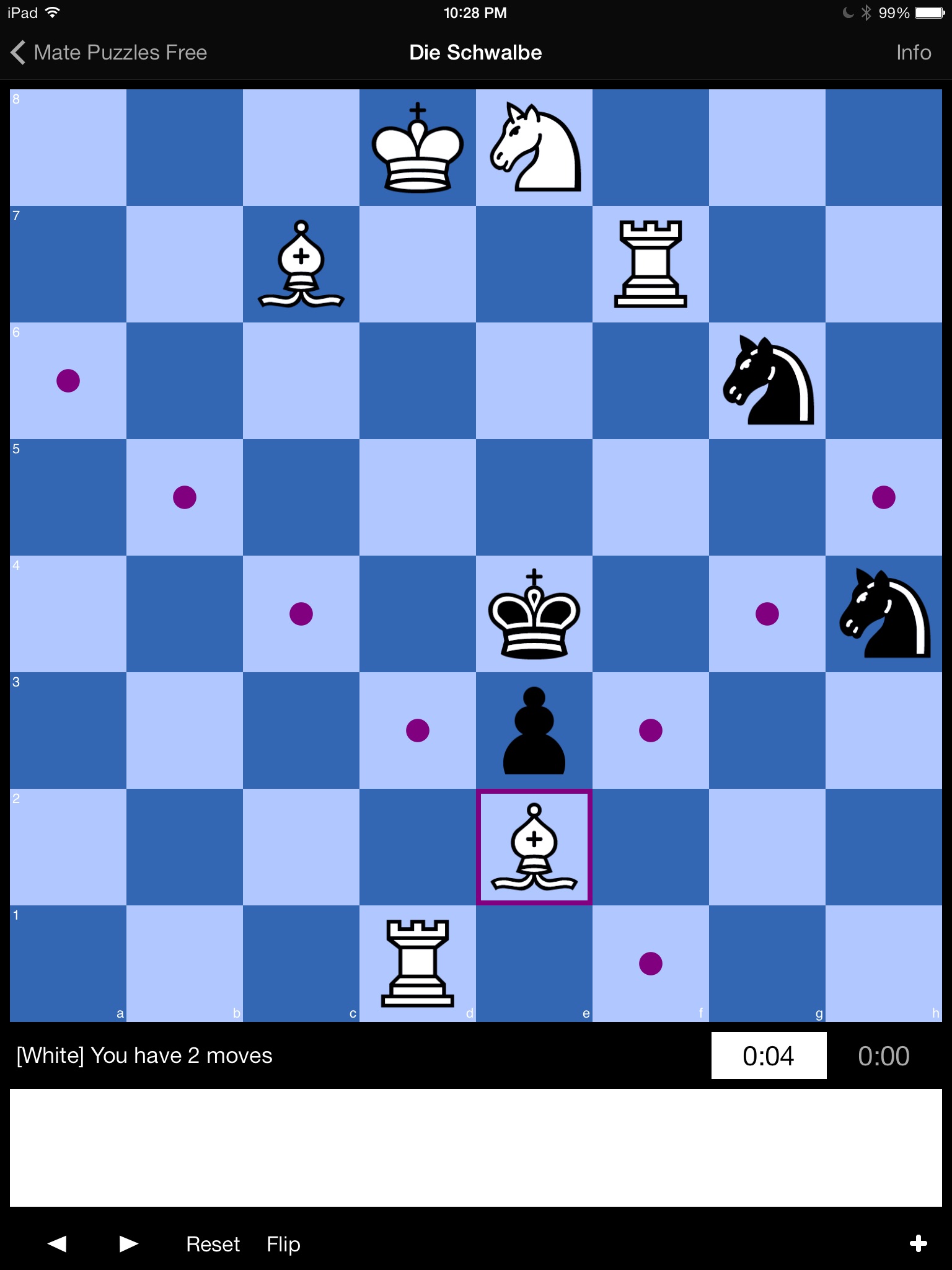 This app has 10 interactive chess problems ranging from easy mate in one move problems to very challenging mate in four moves. The object is to finish each game by forcing a checkmate in a given number of moves. In the full versions of this app there are a much larger number of classical puzzles collected from a variety of sources. These puzzles are fun to play and can be enjoyed at your leisure on your iPhone, iPod touch, and iPad.