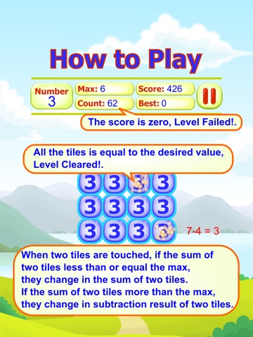 Tap on a tile in the grid, then move to the tiles. When two tiles are touched, if the sum of two tiles less than or equal the max, they change in the sum of two tiles. If the sum of two tiles more than the max, they change in subtraction result of two tiles. All the tiles is equal to the desired value, Level Cleared! The count is zero, Level Failed!