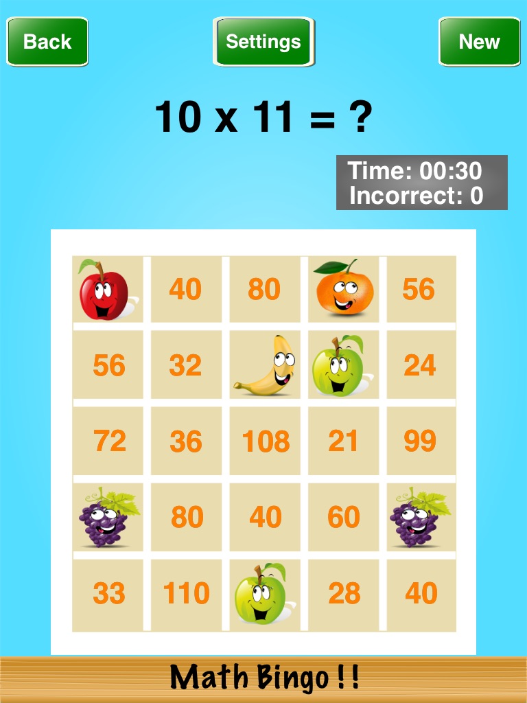 Math Bingo ! ! is a great game for the whole family. Select the operator and difficulty level in the "Settings" screen. Progress through the difficulty levels until you master the game.