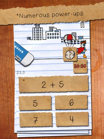 The point of Math Run is to help Super Mathman avoid the evil eraser. The only way to do this is to correctly solve mathematical problems, because only correct answers make Super Mathman run faster. There are numerous power-ups to pick up which help Super Mathman avoid the eraser for a little bit longer. You can choose from three different game difficulties or enter a fully customizable practice mode. The three game difficulties are survival style game modes, so try to avoid the eraser as long as possible. But watch out because the eraser gets faster and faster as you proceed through the round. The game pace will increase dramatically and it will get really hard for Super Mathman to avoid the eraser. There are local leaderboards for every difficulty.
