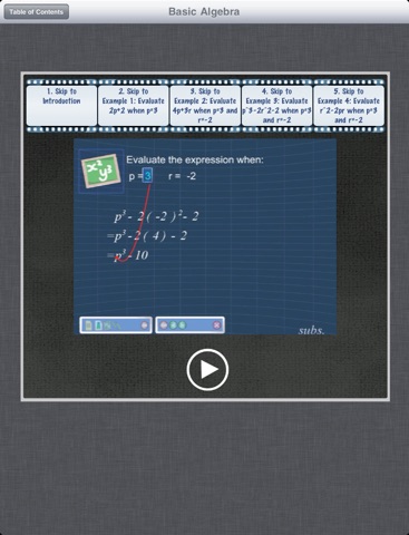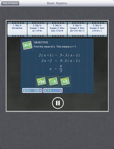 This math video app provides a quick and simple way for you to learn and understand the basics for algebra. All of the 7 computer animated videos are stored in your device. So, no internet connection required to play. These math videos are: Introduction to algebra, Combining like terms, Simplifying expressions: adding like terms, Simplifying expression: removing brackets , Evaluating expressions, Basics on solving linear equations and Examples on solving linear equations. Each of these videos is divided into several different parts that you can easily skipped to. More details below: