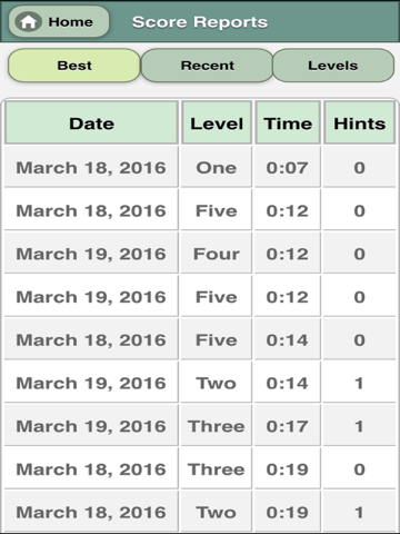 There are five difficulty levels and the ability to ask for a hint when needed. Scores are saved and reports can be created showing the scores.