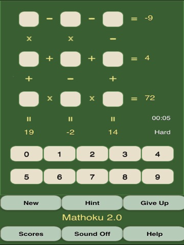 The puzzle game of Mathoku is similar to Sudoku but with a mathematical twist. The goal is to place numbers from zero to nine in the spaces to produce the correct total for each row and column, utilizing the mathematical operations shown. Mathoku is easy to learn and very addictive.