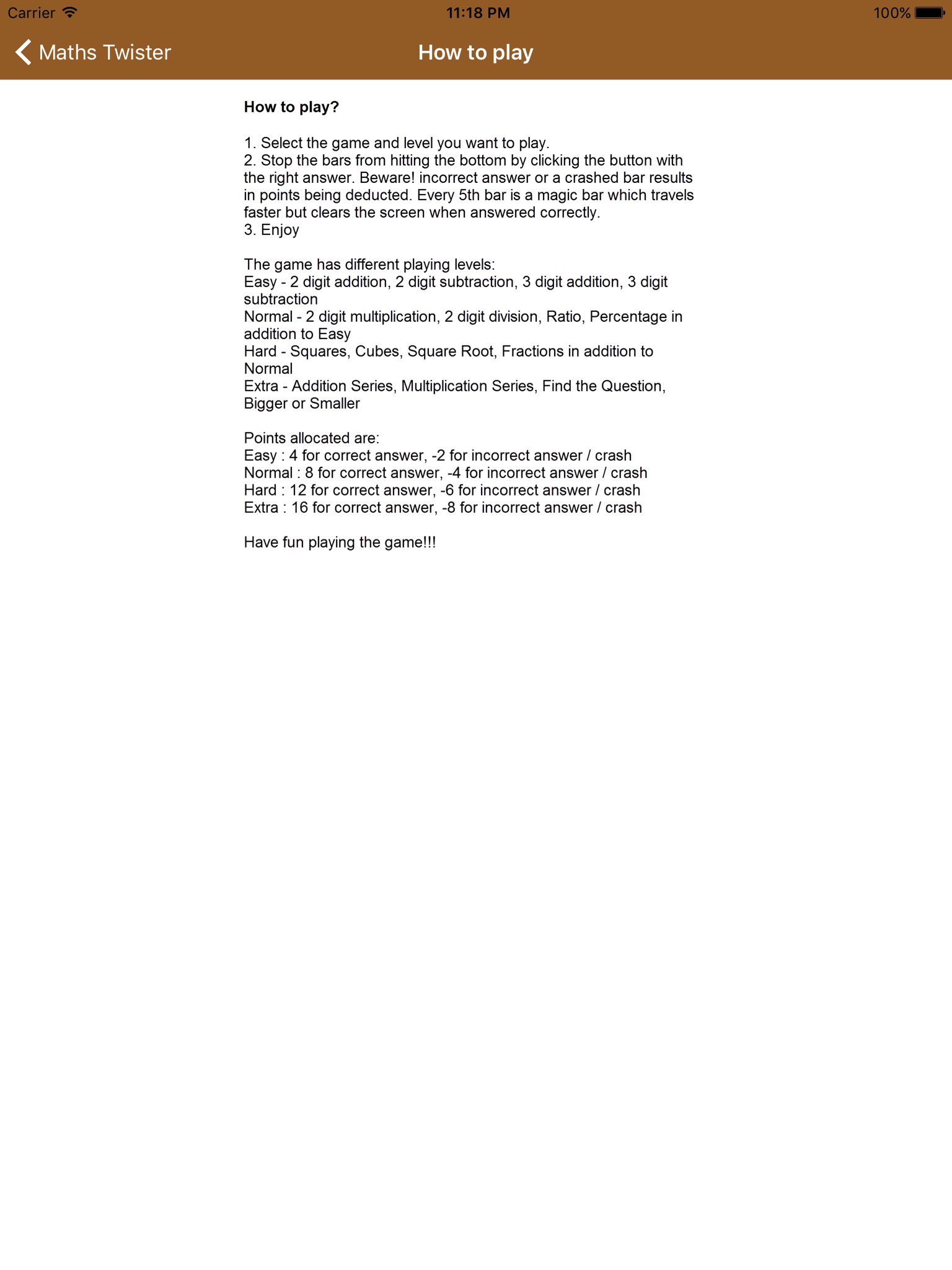2. Stop the bars from hitting the bottom by clicking the button with the right answer. Beware! incorrect answer or a crashed bar results in points being deducted. Every 5th bar is a magic bar which travels faster but clears the screen when answered correctly.