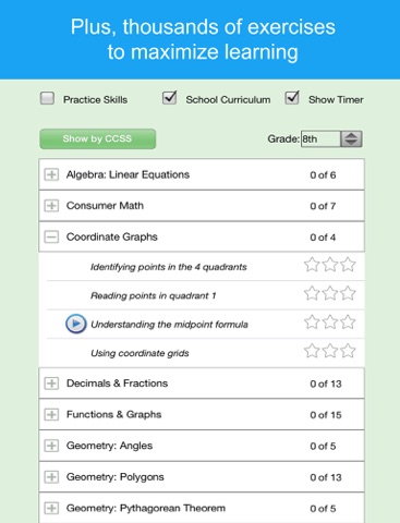 a) Free k-12 math practice skills, including Pre-Algebra, Algebra, Geometry, Statistics, Trigonometry, Pre-calculus, and Calculus.