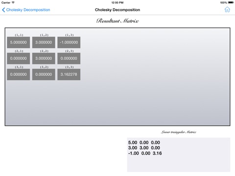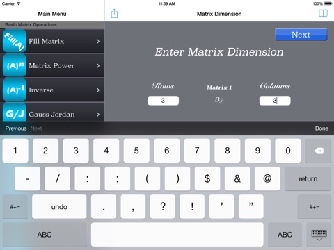 Has an attractive user interface. Fairly simple to enter matrices. I use it mostly for Gauss/Jordan elimination. It crashes often, perhaps one time out of three. I would appreciate future versions saving matrices, for example, taking the solution from a G/J and multiplying by another vector. (As is, you must re-enter it.) Would also appreciate reducing non-square matrices to Reduced Row-Echelon Form. Looking forward to your next version.