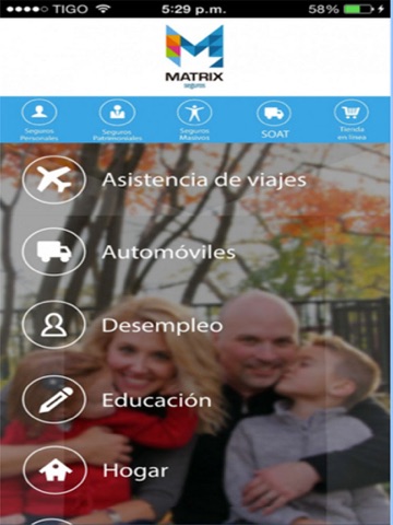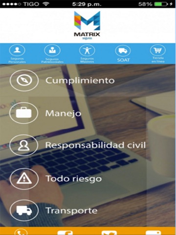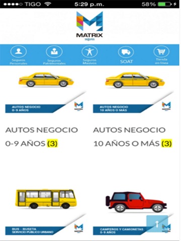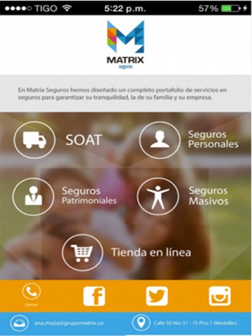 La aplicación de Matrix seguros cuenta con la información de las diferentes líneas de atención y seguros que puedes encontrar en nuestra compañía, además tiene la posibilidad de realizar la compra del SOAT directamente desde la aplicación y que sea enviada a la casa u oficina del cliente.
